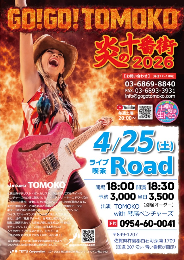 ◆ 開催:2026年4月25日(土) ◆ 時間:開場18:00 開演18:30 ◆ 前売・予約 3,000円 当日 3,500円(別途オーダー) ※TOMOの会のメンバーの方は会場にて500円キャッシュバック! ◆ 出演:TOMOKO with BAND ◆ 会場:ライブ・喫茶 Road (ロード) TEL. 0954-60-0041 〒849-1207 佐賀県杵島郡白石町深浦1709 【紙のチケットは届きませんのでご注意ください】 購入後に「商品を発送しました」というメールが届きますが、紙のチケットは届きません。当日会場にてお名前とお電話番号を確認後、ご入場いただけます。ご飲食代は別途お支払いください。ご不明な点がございましたらお気軽にお問合せ下さい。 【お問合せ】 TET’S corporation TEL. 03-6869-8840(平日12:00~18:00) FAX. 03-6893-3931 [email protected]